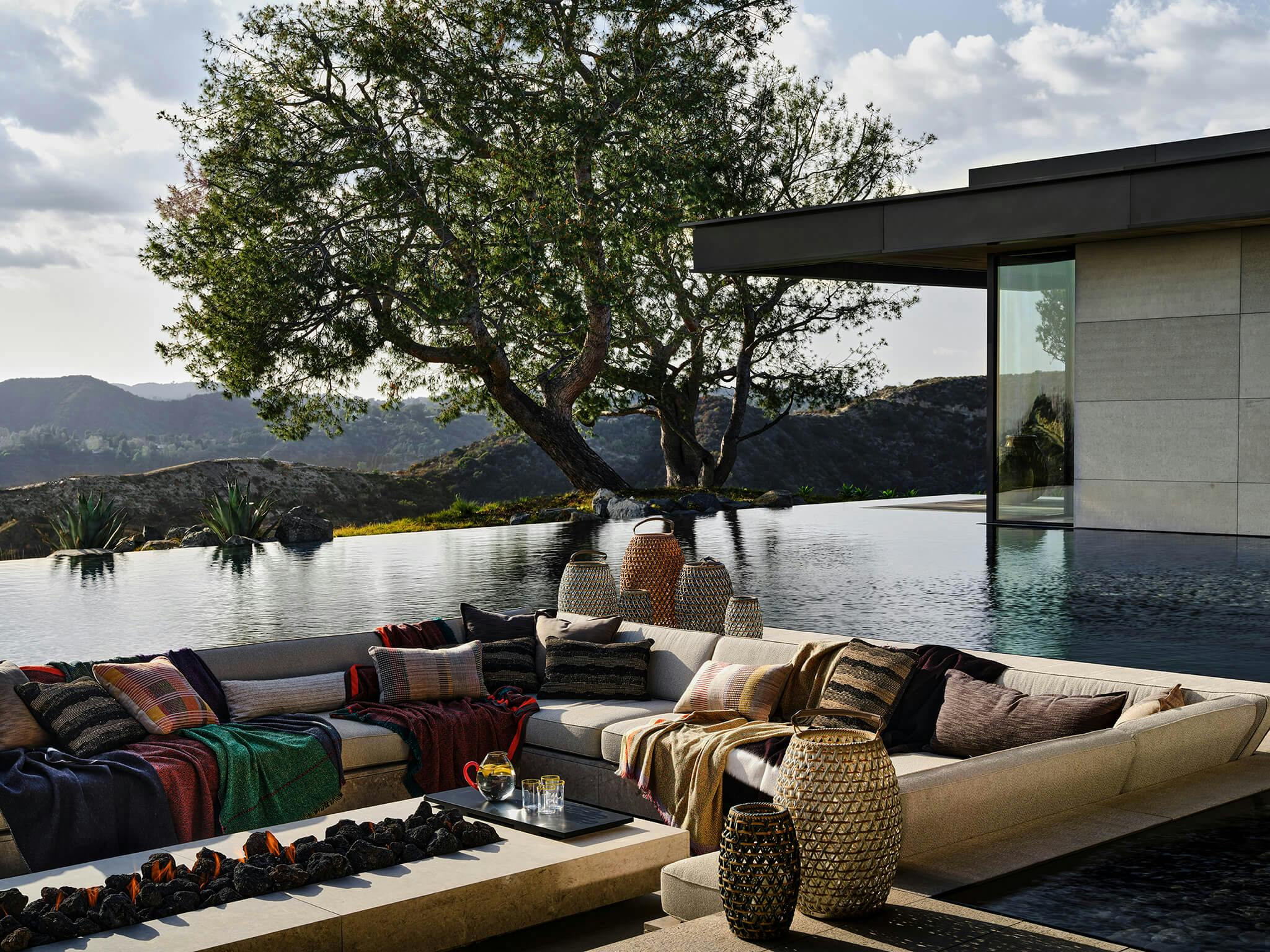This Trousdale home embodies minimalist design that assists in maximizing the outdoor spaces. Upon arrival, a pristine stone motor court features a sculptural specimen olive tree, the first offering of art within the landscape of the compound. Water quickly engages visitors as a mirrored connective element that flows from the entry to the back view over the Santa Monica Mountains. Black granite and Mexican beach pebbles amplify the reflective quality of the water, bringing it to the edge of the living spaces and to an infinity edge beyond, to replay glimpses of the architecture, elements of the garden, and the California sky. The arid garden beyond softly nestles structure and is activated by breezes, dappled sunlight, and bold sunsets.