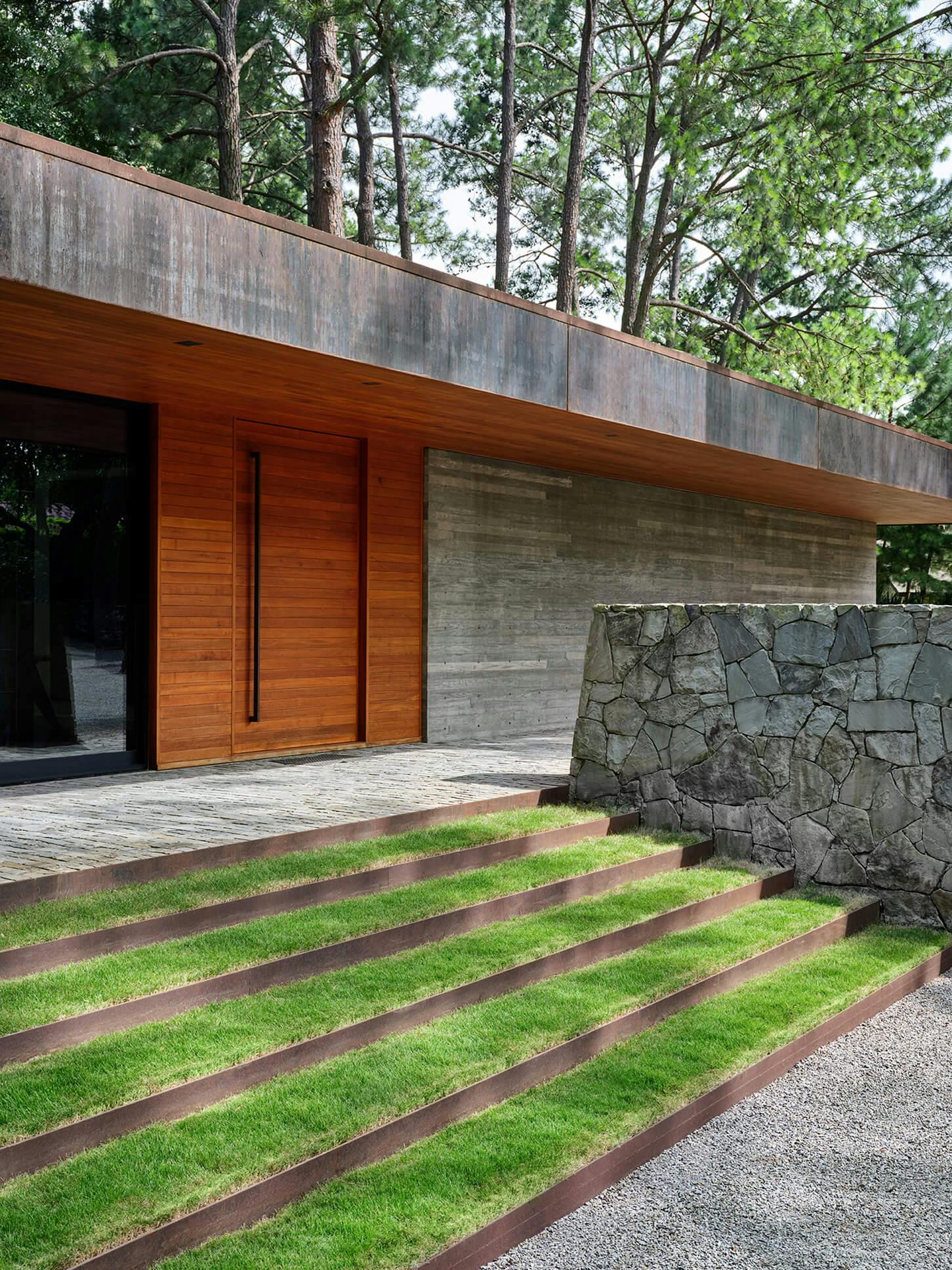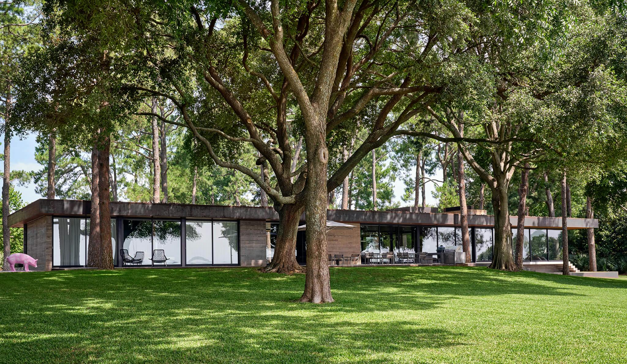 Lake activities have always taken priority here, but Hocker felt that there were also many missed opportunities to enjoy the country setting. A collaboration between Wernerfield, Hocker, and the client resulted in a master plan that reorganized both the site and its functionality. A new house, tennis court, sunken bocce court, and outdoor living room with a fireplace—plus a guest pavilion and garage barn—are harmoniously woven through the majestic pines and live oaks, built with materials—stone, concrete, wood, and steel—that resonate with the woodsy environment.