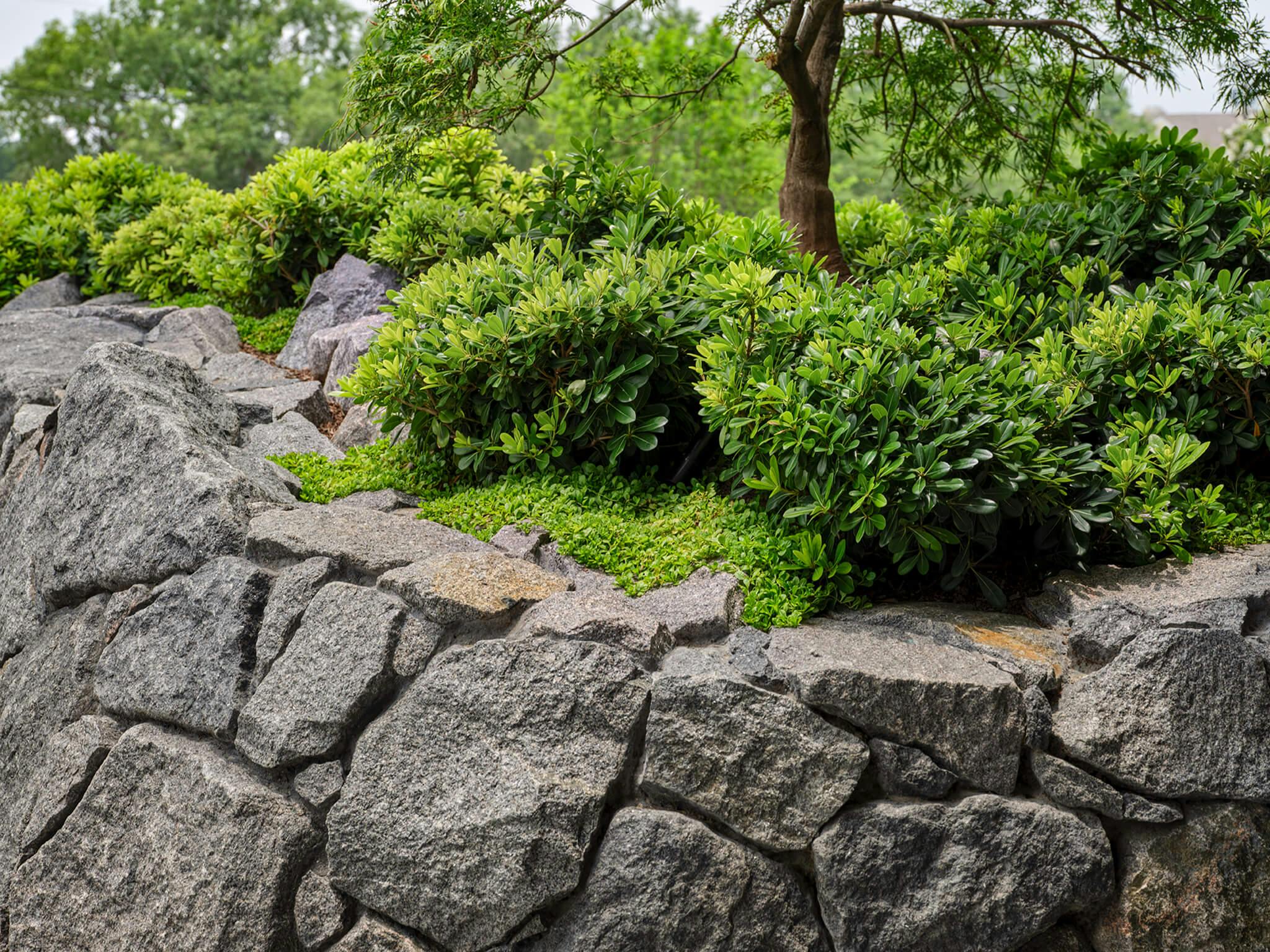 The Lovers Lane Office project originated as a simple, private terrace garden, accessible from the executive office suite within the building. It quickly expanded into a more ambitious exploration in Japanese-inspired materiality and aesthetic. Walls and seating comprised of varied finishes of gray granite provide safe enclosure on the terrace and planting depth for lush specimen trees: Japanese maples, fastigiate sweetgums, and a forked native live oak. A reflective water features a generous bullnose edge that guides the gently flowing water downward, creating textured mosaic ripples that catch and reflect the light. The placid horizontal surface mirrors the sky and surrounding trees. Mounding drifts of dwarf pittosporum interject a soft verdant texture, juxtaposed to the cool tones of the hard granite.