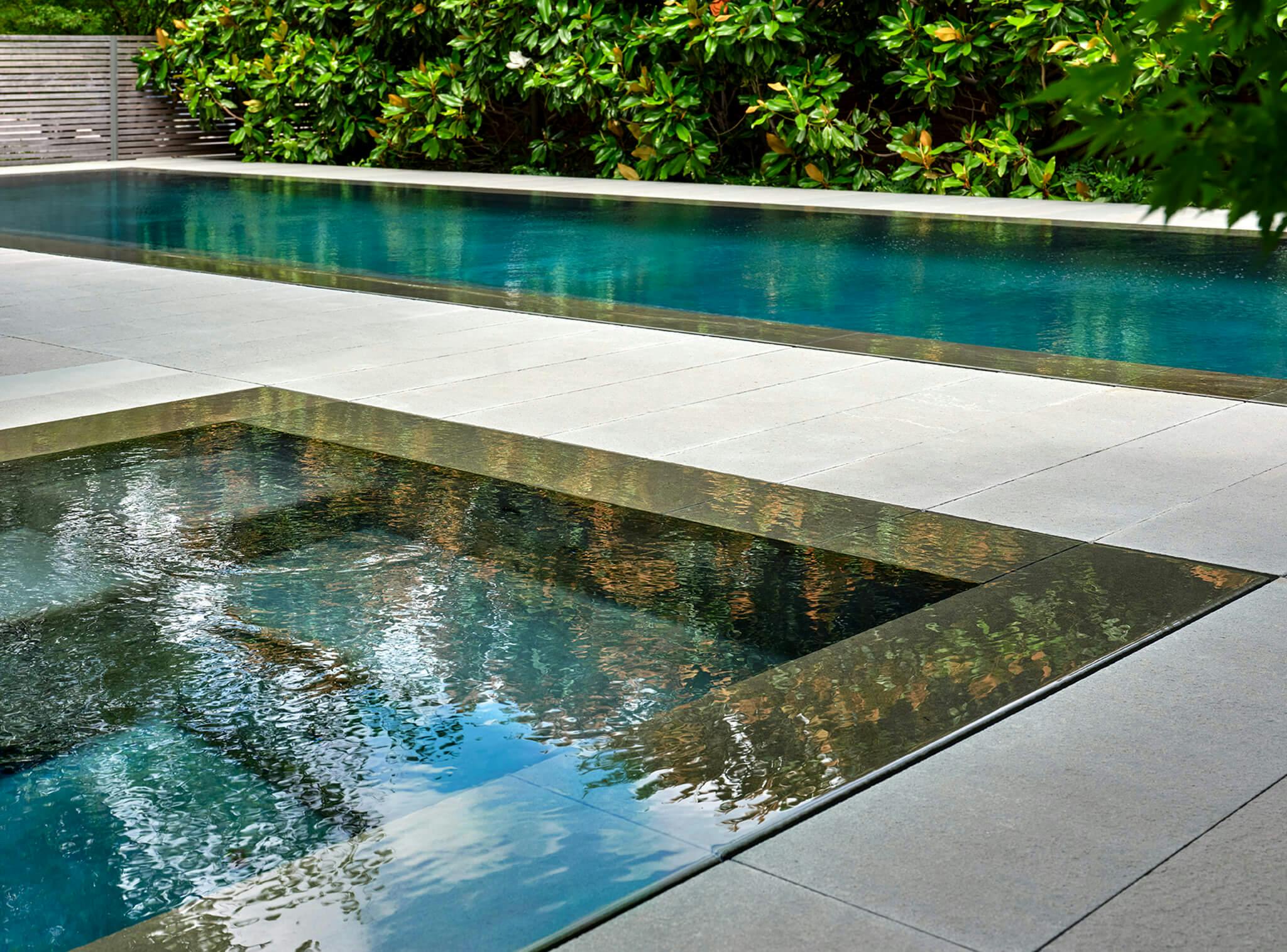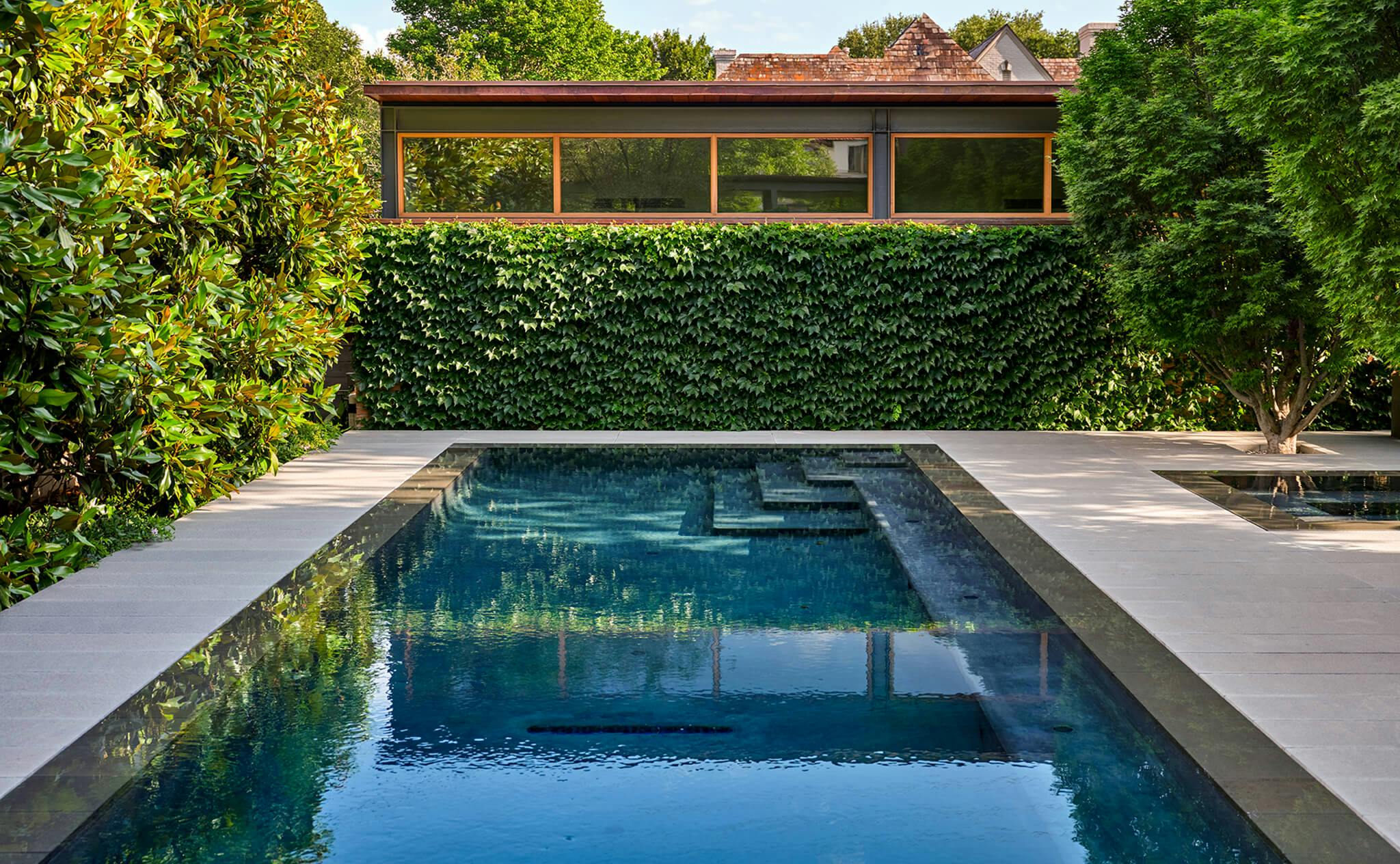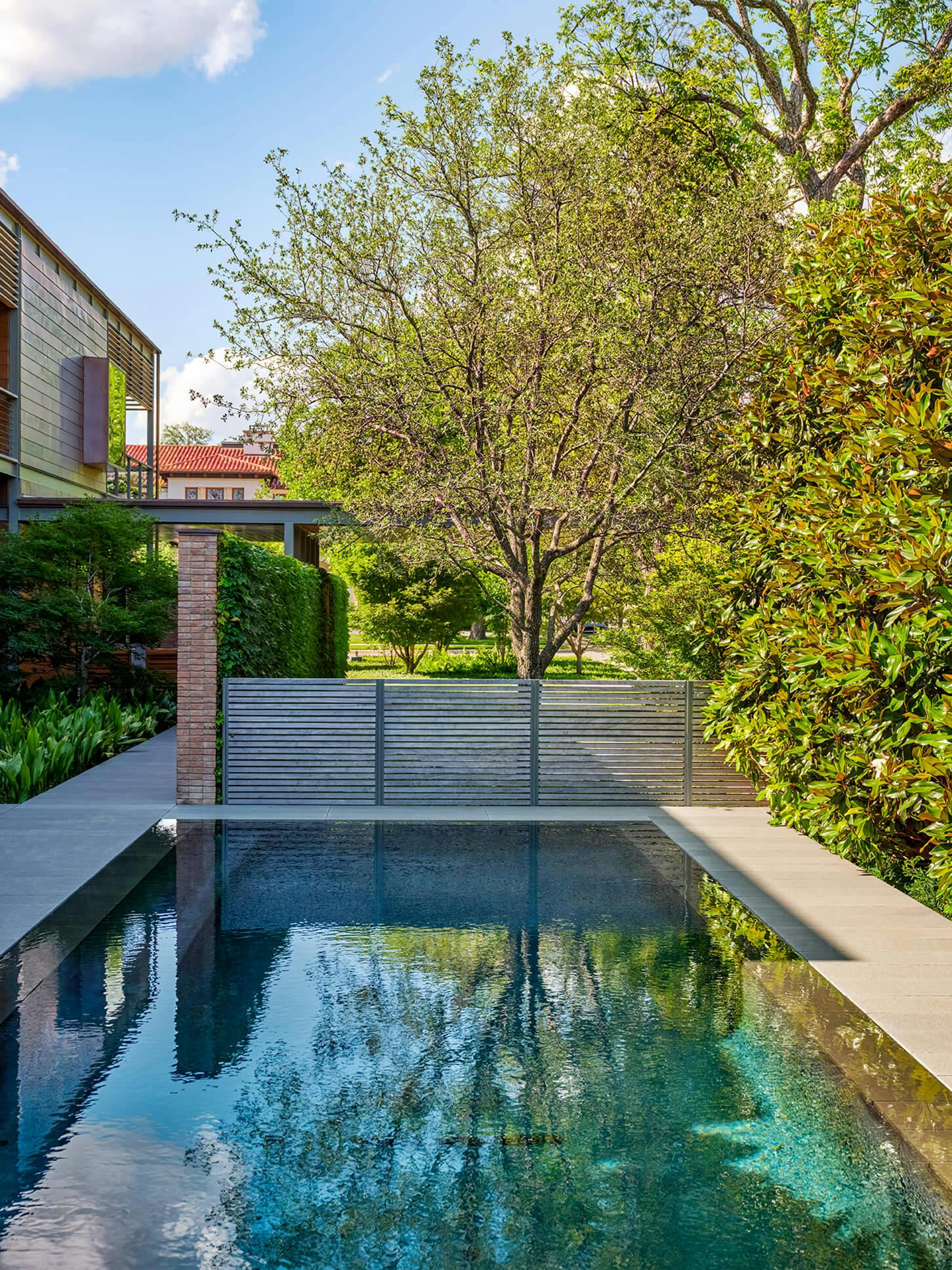 Miramar House features dual public facades facing each street of its intersected location, one welcoming pedestrians, the other vehicles. Heavy planting in the front and side yards, along with vertical green on the courtyard walls, conceal the very transparent house beyond. Within the perimeter enclosure a private pool and spa are nestled into a courtyard. A guest house is separated from the main house, allowing for an adjacent but lower garden featuring seating, a fire feature, sloped woodland planting, boulders, and river birch trees, truly creating a world apart from the surrounding neighborhood and city.