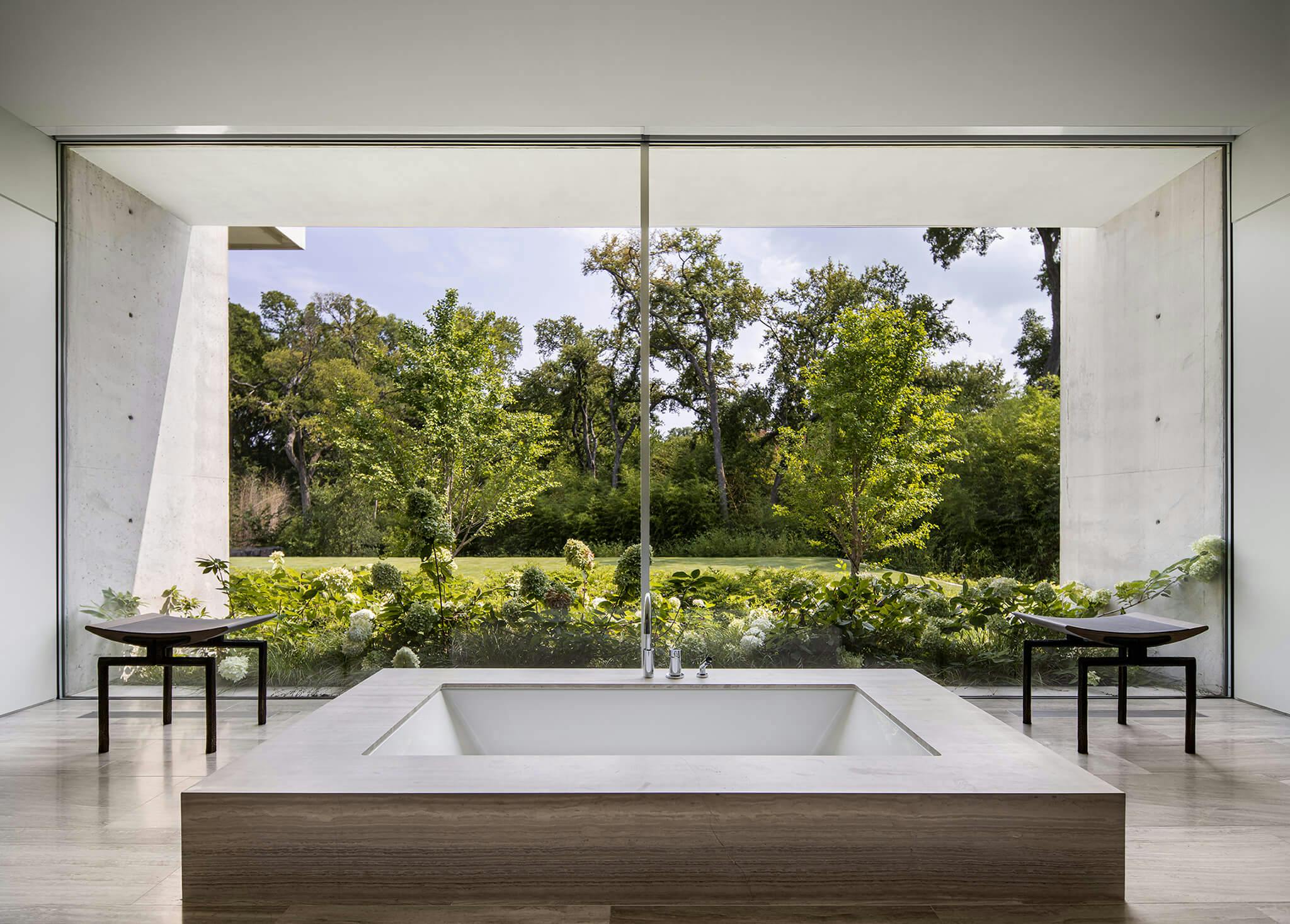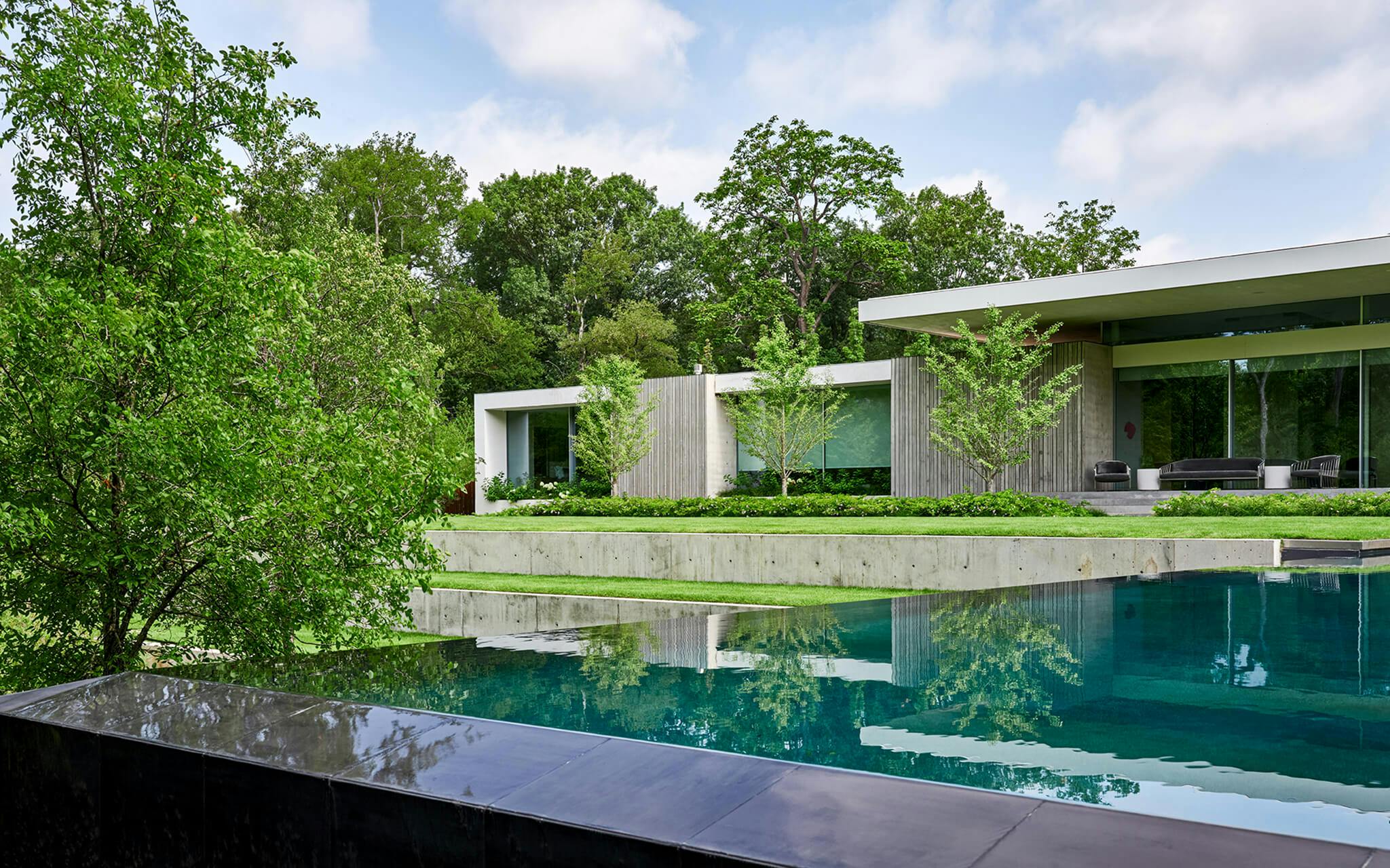 The Miron Residence welcomes nature and water inside while simultaneously concealing private views from the street. Heavy cast-concrete walls extend from the interior of the house into the landscape, creating extensions of indoor space into courtyards with bright, verdant views from every room. A narrow channel of water seemingly courses through the house, beginning at its entry and connecting to the pool beyond where it terminates at a reflective plane extending to the thick vegetation beyond.