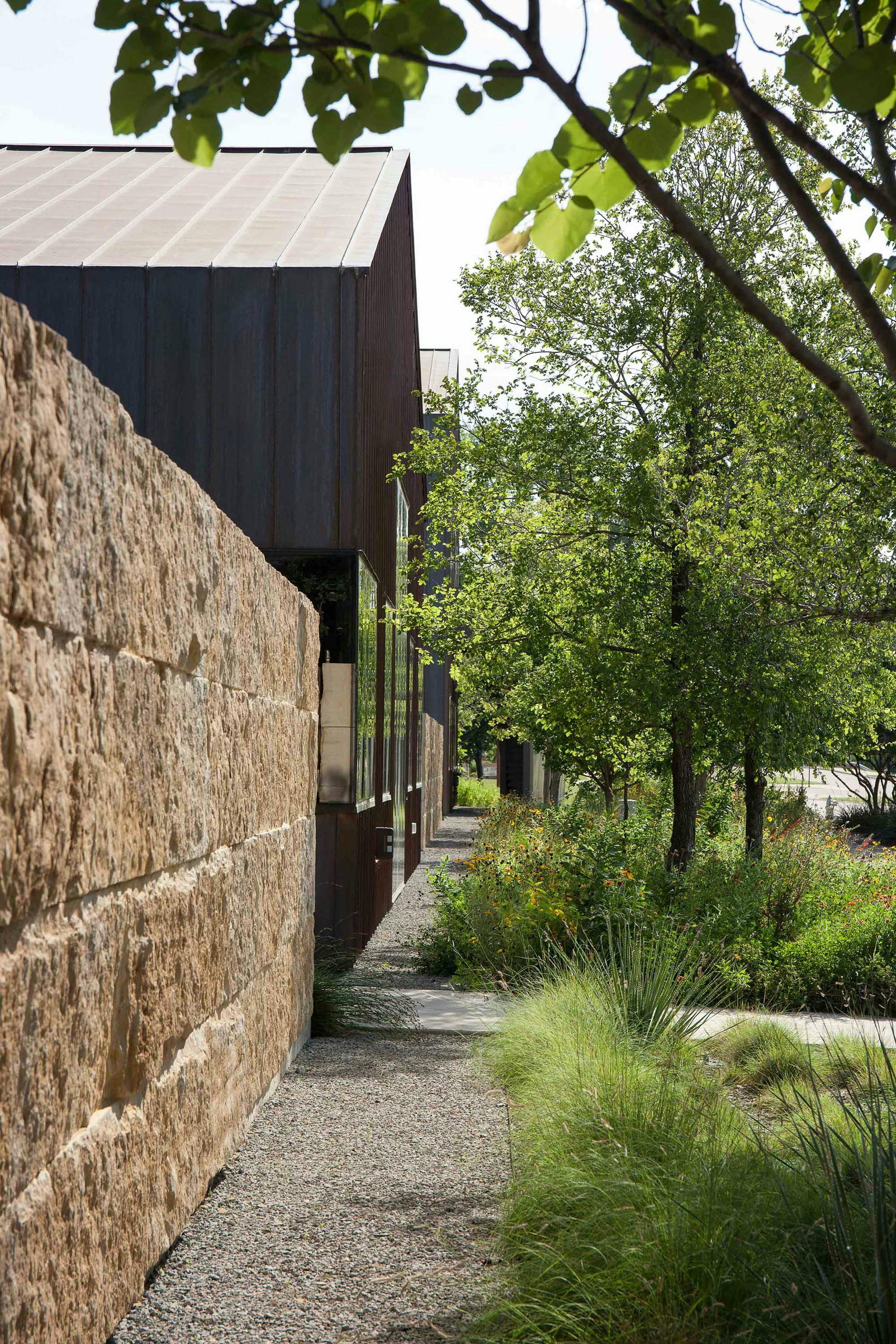 Conceived as a tightly knit urban "campground" for the client, this family office and wellness campus is composed of three copper-clad buildings, linked by carefully programmed outdoor spaces. In collaboration with the architect, Hocker helped master plan the site to take optimal advantage of the native stands of cedar elm and hawthorn trees. Regionally sourced limestone block walls provide both privacy to the internal spaces of the site and screening for the mechanical systems of the buildings. A perimeter landscape of native wildflowers, grasses, cacti and reforested trees blends the concise geometric architecture into the site with a strong nod to the native Cross Timbers and Blackland Prairies of the former ranch.